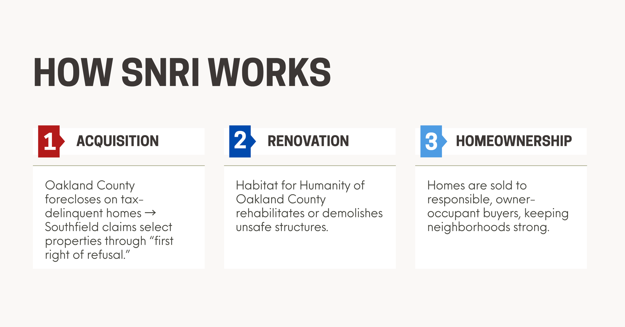 The Southfield Neighborhood Revitalization Initiative (SNRI) is more than just a housing program. This is an investment in the quality of life for every resident. By preventing speculative buyers from acquiring properties and preventing homes from sitting vacant, SNRI protects neighborhood stability, preserves property values, and maintains a strong tax base.